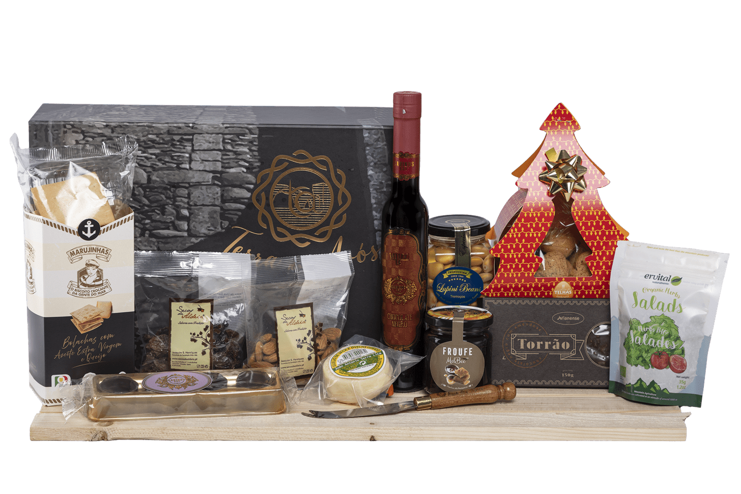 MARUJINHAS COM AZEITE E QUEIJO TELHAS CONFEITARIA - 1 embalagem 200g | PASSAS DE UVA SEM GRAINHA SECOS DA ALDEIA - 1 embalagem 100g | MIOLO DE AMÊNDOA COM PELE SECOS DA ALDEIA - 1 embalagem 100g | QUEIJO MERENDEIRA VACA E OVELHA SERRA LICA - 1 unidade 200g | FACA QUEIJO TERRA DOS AVÓS BY FILMAM - 1 unidade | LICOR CARINUS EST CHOCOLATE NEGRO DOURO’S FLAVOUR - 1 garrafa 200ml | COPOS DE CHOCOLATE CARINUS EST - 1 embalagem 4 copos | MEL DE FLORES SILVESTRES FROUFE - 1 frasco 250g | TREMOÇO COM MALAGUETA TREMOCEIRA - 1 frasco 280g | TABLETE TORRÃO CHOCOLATE NEGRO COM AMÊNDOA AVIANENSE - 1 unidade 150g | PINHEIRINHO COM BOLACHAS GENGIBRE TELHAS CONFEITARIA - 1 embalagem 150g | MISTURA PARA SALADAS BIO ERVITAL - 1 embalagem | CAIXA-CABAZ LUXURY - 1 unidade | CARTÃO DE BOAS FESTAS - 1 unidade