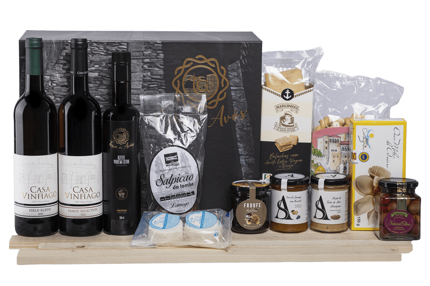 VINHO BRANCO CASA DE VINHAGO FIELD BLEND - 1 garrafa 75cl | CASA DE VINHAGO FAMILY SELECTION - 1 garrafa 75cl | AZEITE VIRGEM EXTRA TERRA DOS AVÓS - 1 garrafa 500ml | PACK 2 QUEIJOS DE CABRA CURADO SERRA LICA - 1 unidade 200g | SALPICÃO DO LOMBO FUMEIRO PORFÍRIOS - 1 unidade 300g | MEL DE FLORES SILVESTRES FROUFE - 1 frasco 250g | DOCE DE LARANJA COM MOSCATEL ALQUIMIA DOS SABORES - 1 frasco 250g | MARUJINHAS COM AZEITE E QUEIJO TELHAS CONFEITARIA - 1 embalagem 200g | PASTA DE GRÃO ALQUIMIA DOS SABORES - 1 frasco 250g | ROSQUINHAS DE AZEITE GOURMET TELHAS CONFEITARIA - 1 embalagem 140g | OVOS MOLES AVEIRO CARLOS SARAIVA - 1 embalagem 150g | AZEITONA CURA NATURAL COM ERVAS AROMÁTICAS TREMOCEIRA - 1 frasco 280g | CAIXA-CABAZ LUXURY TERRA DOS AVÓS - 1 unidade | CARTÃO DE BOAS FESTAS - 1 unidade